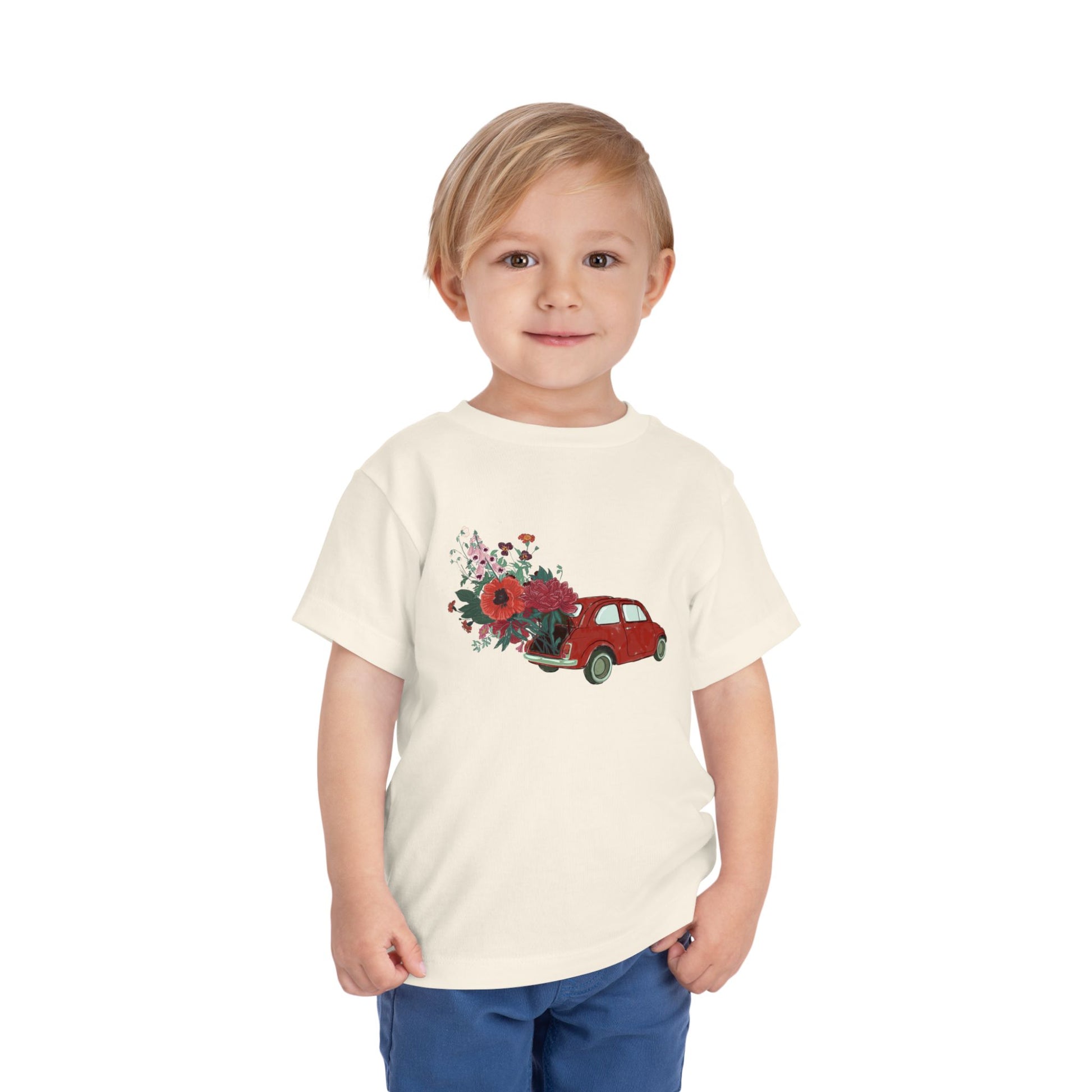 This whimsical tee features a classic red car with its trunk overflowing with flowers, ready for a joyfride into the unknown. It's a little bit wanderlust, a little bit daydream - a celebration of spontaneous beauty and unexpected magic. Ideal for toddlers who love to explore, this shirt is perfect for family travels or playdates, encouraging a love for adventure from a young age.